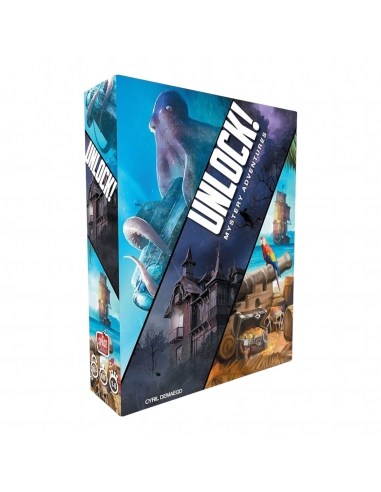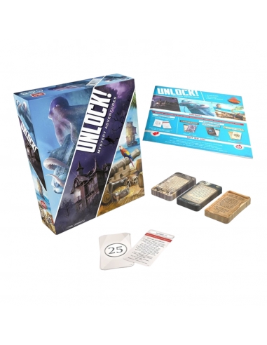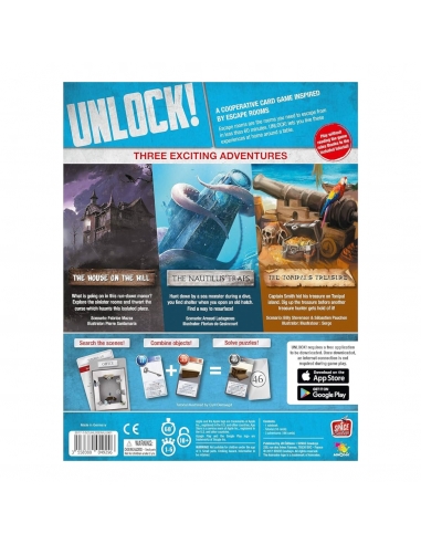 Unlock! is a cooperative card game inspired by escape rooms that uses a simple system which allows you to search scenes, combine objects, and solve riddles. Play Unlock! to embark on great adventures, while seated at a table using only cards and a companion app that can provide clues, check codes, monitor time remaining, etc. Unlock! Mystery Adventures features three "escape room" scenarios that you can play on your tabletop: The House on the Hill: What's going on in this run-down manor? Explore the sinister pieces and foil the curse that haunts this desolate place. Designed by Fabrice Mazza, illustrated by Pierre Santamaria. The Nautilus' Traps: Attacked by a sea monster during a dive, you seek shelter by opening a hatch in an old submarine. Find a way back to the surface! Designed by Arnaud Ladagnous, illustrated by Florian de Gesincourt. The Tonipal's Treasure: Captain Smith hid his treasure on Tonipal Island. Unravel the mystery before Johnson, another treasure hunter, beats you to it! Designed by Billy Stevenson & Sebastien Pauchon, illustrated by Sergo. Note: Unlock! requires a free application to be downloaded from the App Store or Google Play. Once downloaded, an internet connection is not required during game play.