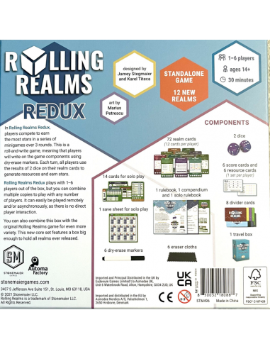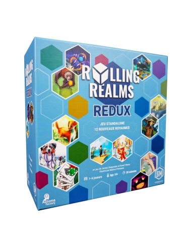 Το Rolling Realms Redux είναι ένα αυτόνομο παιχνίδι και περιλαμβάνει όλα όσα χρειάζεστε για να παίξετε έως και 6 παίκτες. Διαθέτει τους ίδιους κανόνες και πλήρη συμβατότητα με τον προκάτοχό του, το Rolling Realms, αλλά με 12 νέα βασίλεια εμπνευσμένα από δημοφιλή παιχνίδια άλλων εκδοτών, μια έντυπη έκδοση του ζωντανού βιβλίου κανόνων που θα περιλαμβάνει εξηγήσεις για όλα τα βασίλεια (πρωτότυπα, νέα και προωθητικά), με τα πάντα σε ένα κουτί σχεδιασμένο για να χωράει σε όλα τα βασίλεια που έχουν εκτυπωθεί ποτέ.