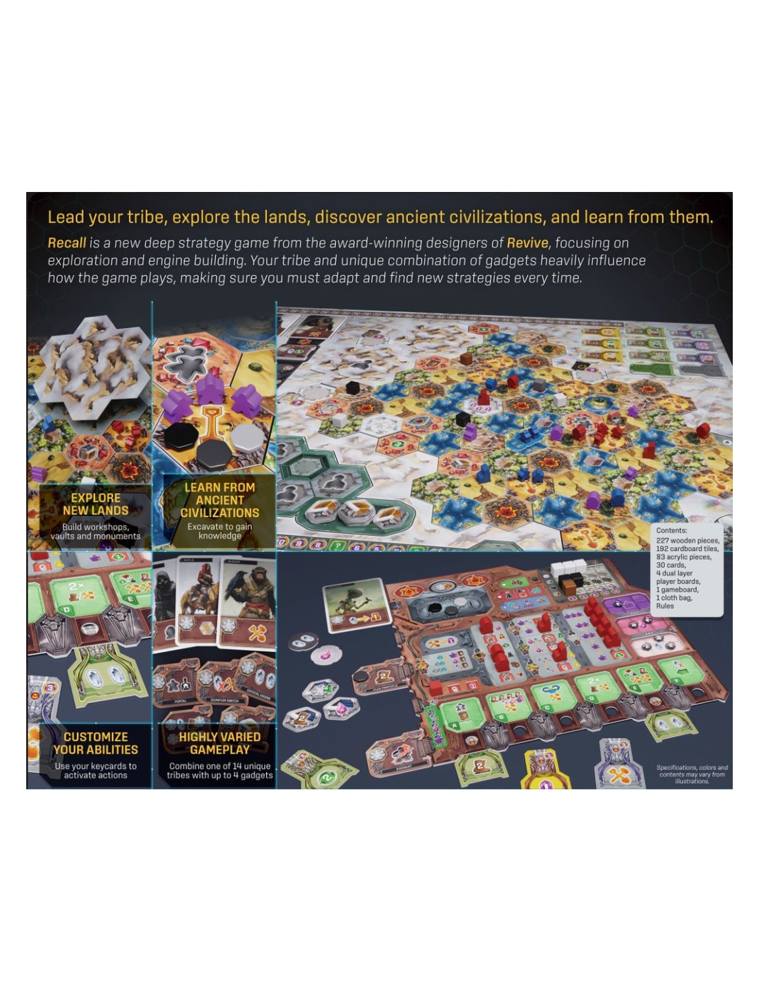 Το Recall είναι ένα βαθύ παιχνίδι στρατηγικής από τους σχεδιαστές του Revive που επικεντρώνεται στην κατασκευή μηχανών και την εξερεύνηση. Κάθε παίκτης ξεκινά το παιχνίδι με μία από τις δεκατέσσερις μοναδικές φυλές και ένα από τα δεκαοκτώ μοναδικά gadget, τα οποία θα επηρεάσουν σε μεγάλο βαθμό τη στρατηγική και τις ευκαιρίες σας. Καθ' όλη τη διάρκεια του παιχνιδιού, θα ηγηθείτε της φυλής σας, θα εξερευνήσετε τις περιοχές και θα ανακαλύψετε ίχνη αρχαίων πολιτισμών για να μάθετε από αυτά. Στη σειρά σας, μπορείτε είτε: