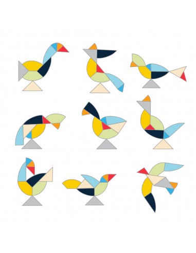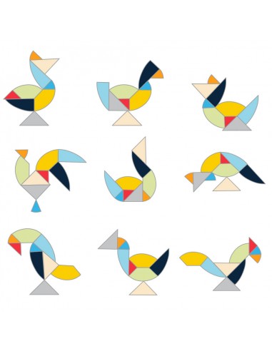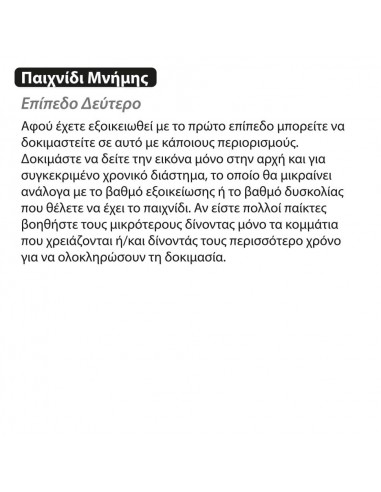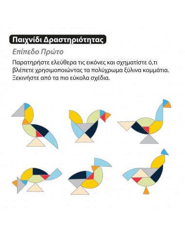 Τρία διαφορετικά παιχνίδια. Παιχνίδι Δραστηριότητας: Σχηματίστε εικόνες που δίνονται χρησιμοποιώντας τα πολύχρωμα ξύλινα κομμάτια. Παιχνίδι Μνήμης: Δοκιμάστε να δείτε την εικόνα μόνο στην αρχή και για συγκεκριμένο χρονικό διάστημα, πριν τη σχηματίσετε. Παιχνίδι Γρίφος: Προσπαθήστε να σχηματίσετε τα πολύχρωμα σχέδια βλέποντας όμως μόνο τις μονόχρωμες εικόνες. Περιέχονται ελληνικές οδηγίες.