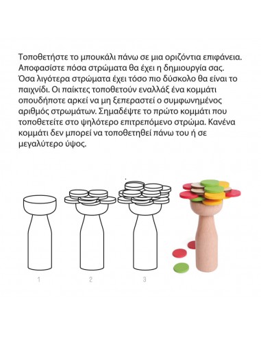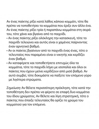 Σημαδέψτε το πρώτο κομμάτι που τοποθετείτε στο ψηλότερο επιτρεπόμενο στρώμα. Κανένα κομμάτι δεν μπορεί να τοποθετηθεί πάνω του ή σε μεγαλύτερο ύψος. Αν ένας παίκτης ρίξει κατά λάθος κάποιο κομμάτι, τότε θα πρέπει να τοποθετήσει τα κομμάτια που έριξε συν άλλο ένα. Αν ένας παίκτης ρίξει τρία ή παραπάνω κομμάτια στη σειρά του, τότε χάνει και βγαίνει από το παιχνίδι. • Αν ένας παίκτης ρίξει ολόκληρη την κατασκευή, τότε το παιχνίδι τελειώνει και αυτός είναι ο χαμένος παίρνοντας έναν αρνητικό βαθμό. • Αν οι παίκτες βγαίνουν από το παιχνίδι ένας-ένας, τότε ο τελευταίος που παραμένει είναι ο νικητής και κερδίζει έναν βαθμό. • Αν καταφέρετε και τοποθετήσετε επιτυχώς όλα τα κομμάτια, τότε το παιχνίδι λήγει με ισοπαλία και όλοι οι παίκτες που έχουν μείνει κερδίζουν από μισό βαθμό. Αν αυτό συμβεί, τότε δοκιμάστε να παίξετε τον επόμενο γύρο με λιγότερα στρώματα. Σημείωση: Αν θέλετε περισσότερη πρόκληση, τότε κατά την τοποθέτηση δεν πρέπει να φέρετε σε επαφή δυο κομμάτια του ίδιου χρώματος. Αν θέλετε και λίγη στρατηγική, τότε ο παίκτης που έπαιξε τελευταίος θα ορίζει το χρώμα του κομματιού για τον επόμενο.