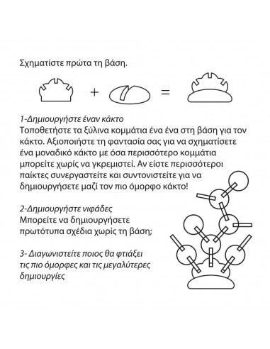 Τοποθετήστε τα ξύλινα κομμάτια ένα ένα στη βάση για τον κάκτο. Αξιοποιήστε τη φαντασία σας για να σχηματίσετε ένα μοναδικό κάκτο με όσα περισσότερο κομμάτια μπορείτε χωρίς να γκρεμιστεί. Αν είστε περισσότεροι παίκτες συνεργαστείτε και συντονιστείτε για να δημιουργήσετε μαζί τον πιο όμορφο κάκτο! Δημιουργήστε νιφάδες. Μπορείτε να δημιουργήσετε πρωτότυπα σχέδια χωρίς τη βάση; Διαγωνιστείτε ποιος θα φτιάξει τις πιο όμορφες και τις μεγαλύτερες δημιουργίες. Περιέχονται ελληνικές οδηγίες.