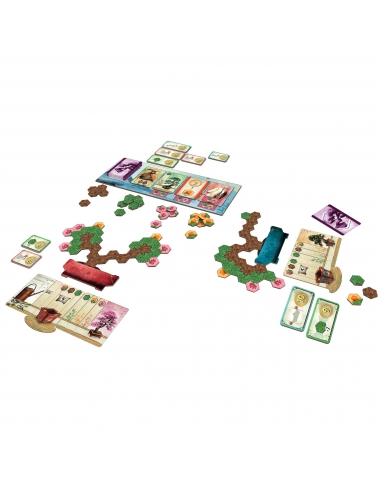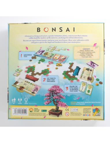 The Japanese term "bonsai" means "planted in a pot". A bonsai is a living work of art, a perfect miniature plant, identical in all respects to its full-size simile, but several times smaller. In Bonsai, players take on the role of expert bonsai masters intent on growing their own bonsai. Whoever grows the best plant will be appointed to show their Bonsai at the Imperial gardens. On your turn, choose and perform one of these two actions: meditate or cultivate. If you meditate, choose one of the face up cards on the board and take it, along with any Bonsai tiles represented below the card you draw. If you cultivate, you can place in your Bonsai the tiles which are in your personal supply. You can place as many tiles as the total symbols depicted on your Seishi tile and any or all of your Growth cards. Each symbol will let you place one tile of the corresponding type. During the turn in which your bonsai matches or exceeds the requirements of a Goal tile that is still in the middle of the table (i.e., the Goal tile has not been claimed yet by any player), you must immediately choose whether you want to claim that tile or if you want to renounce it in order to try to achieve a harder Goal tile. When the last card from the deck is revealed, the game end is triggered. Each tile in your bonsai is worth a certain number of points. In the solo game you can try the Additional Scenarios that change some rules and goals, and eventually try to beat the Emperor Challenge.