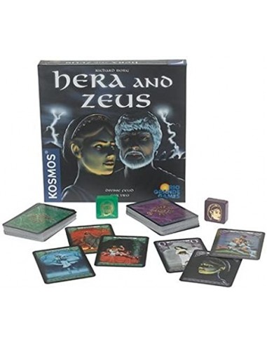 Players are opposing gods from Greek mythology, Hera and Zeus, bent on destroying each other because each kidnapped the other's favorite mortal. Players lay out cards in opposite three-column, four-row matrices. Cards on the leading edges of the opposing columns can be used to attack, which means the combat value of the cards are compared and the loser is destroyed. However, cards are played facedown until they're engaged, adding an element of bluff and doubt to the game. Each turn, players have as many actions as they have columns, and actions can be used to attack, draw cards, or play special action cards. To win, you need to reduce the other player to zero columns, capture their hostage card from their hand, or make sure your opponent cannot use all of their actions during their turn.