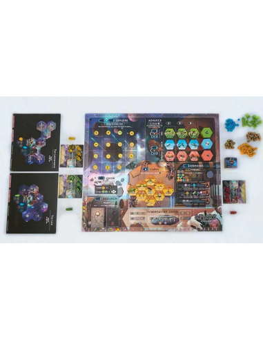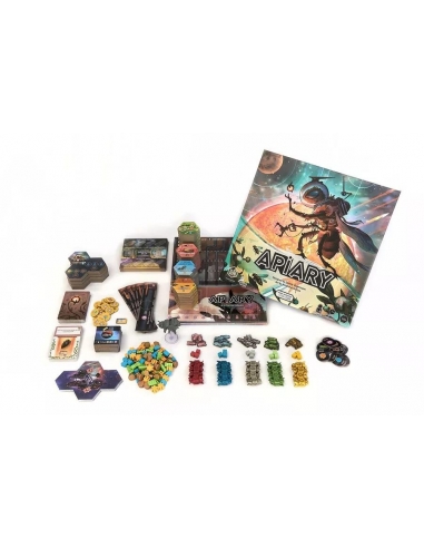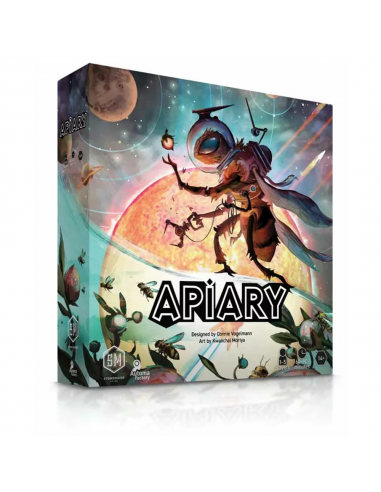 In Apiary, each player controls one of twenty unique factions. Your faction starts the game with a hive, a few resources, and worker bees. A worker-placement, hive-building challenge awaits you: explore planets, gather resources, develop technologies, and create carvings to demonstrate your faction's strengths (measured in victory points) over one year's Flow. However, the Dearth quickly approaches, and your workers can take only a few actions before they must hibernate! Can you thrive or merely survive?