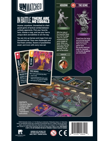 Unmatched is a highly asymmetrical miniature fighting game for two or four players. Each hero is represented by a unique deck designed to evoke their style and legend. Tactical movement and no-luck combat resolution create a unique play experience that rewards expertise, but just when you've mastered one set, new heroes arrive to provide all new match-ups. Unmatched: Houdini vs. The Genie adds two new heroes: Harry Houdini and The Genie of the Lamp.