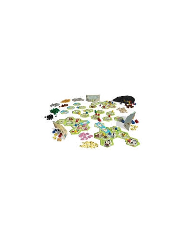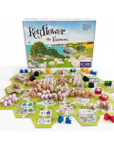 Keyflower: The Farmers is an expansion for the game Keyflower. In that game, each player develops his own unique village over four seasons by successfully bidding on a variety of village tiles (specialized buildings and boats), skills, resources, and workers ("keyples"). In Keyflower: The Farmers, players develop the agricultural side of their economy by acquiring new farm buildings, growing wheat, and collecting and breeding farm animals (cows, pigs, and sheep). Animals are kept in the fields created by the layout of the roads, adding a new dimension and considerations to the base game. Points can now be scored through the acquisition and breeding of the animals, by harvesting wheat, and from the layout of the fields. Players may choose to use all of the tiles from Keyflower: The Farmers and add tiles at random from Keyflower to make up the required number of tiles or simply mix the two sets of tiles.