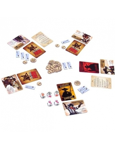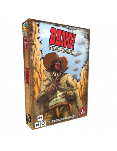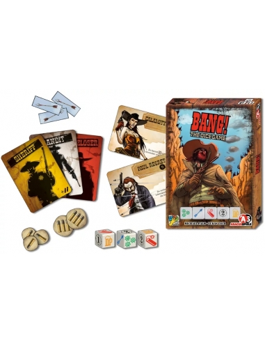 In the U.S. wild west, the eternal battle between the law and the outlaws keeps heating up. Suddenly, a rain of arrows darken the sky: It's an Indian attack! Are you bold enough to keep up with the Indians? Do you have the courage to challenge your fate? Can you expose and defeat the ruthless gunmen around you? BANG! The Dice Game keeps the core of the Bang! card game in place. At the start of the game, players each take a role card that secretly places them on a team: the Sheriff and deputies, outlaws, and renegades. The Sheriff and deputies need to kill the outlaws, the outlaws win by killing the Sheriff, and the renegades want to be the last players alive in the game. Each player also receives a character card which grants him a special power in the game. The Sheriff reveals his role card and takes the first turn of the game. On a turn, a player can roll the five dice up to three times, using the results of the dice to shoot neighboring players, increase the range of his shots, heal his (or anyone else's) life points, or put him in range of the Indians, which are represented by nine tokens in the center of the table. Each time a player rolls an arrow, he takes one of these tokens; when the final token is taken, each player loses one life point for each token he holds, then the tokens are returned to the center of the table. If a player collects a trio of Gatling symbols on the dice, he fires one shot at everyone else and rids himself of Indian tokens. Who'll get his shot off first? Play continues until one team meets its winning condition – and death won't necessarily keep you from winning as long as your teammates pull through!