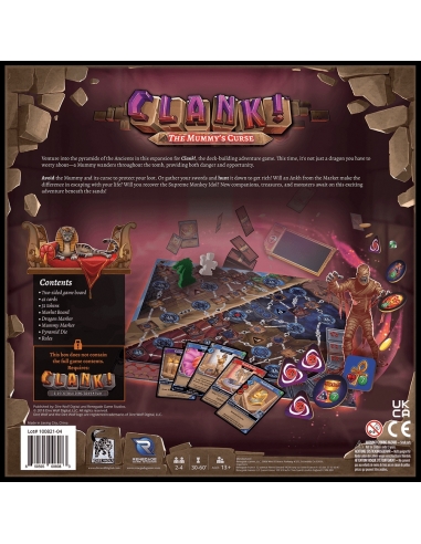Untold riches await inside the pyramids of the Ancients — but they are well protected. An undying Mummy guardian spreads a vile curse to those who would rob its tomb. And, inevitably, the treasure has attracted a dragon. Can you escape the fearsome Croxobek? Clank! The Mummy's Curse, an expansion for Clank!: A Deck-Building Adventure, adds a wandering mummy to the pathways that players will explore as well as new artifacts to acquire in the depths of the pyramid!