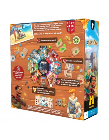 Brigands is an asymetrical game of deduction and trickery that pits a prince against rival bands of brigands. The prince must protect the coffers of the city against brigands. If no brigand succeeds in stealing 50 Ducats from the kingdom at the end of the 6 game turns, the prince is victorious! Otherwise, the richest bandit wins.