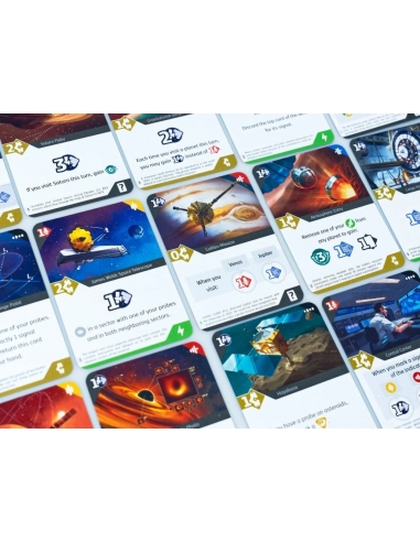 You will also make use of over 200 cards to aid your efforts or focus your research in a particular direction for additional bonuses and rewards. Each card has unique effects and illustrations and depicts real-life technologies, projects, and discoveries (like the ISS, Large Hadron Collider, Perseverance rover, Voyager probe, and many more).