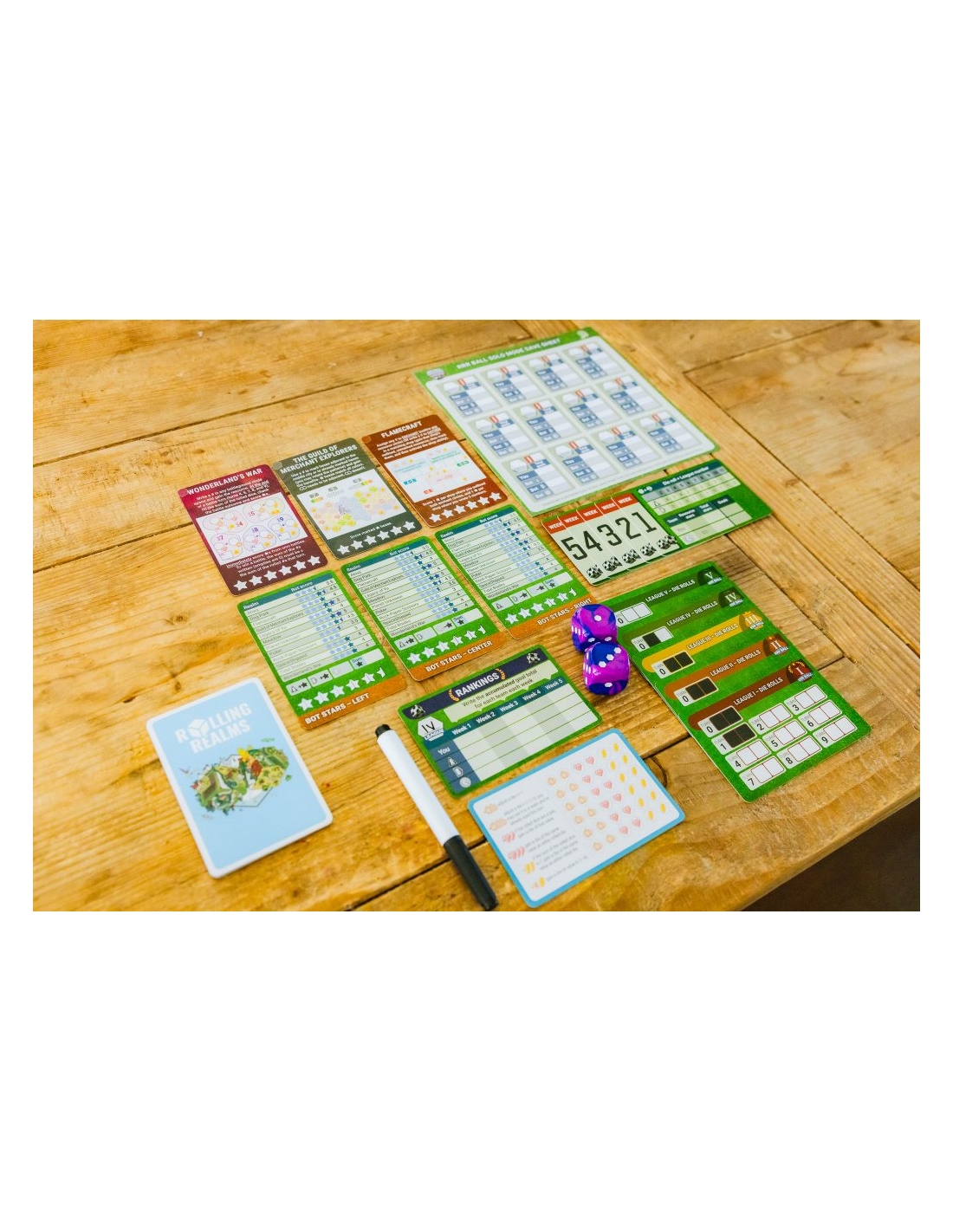 Each turn, one player rolls 2 dice, and all players use the dice results on their realm cards to generate resources and earn stars. After 3 rounds, the player with the most stars wins!