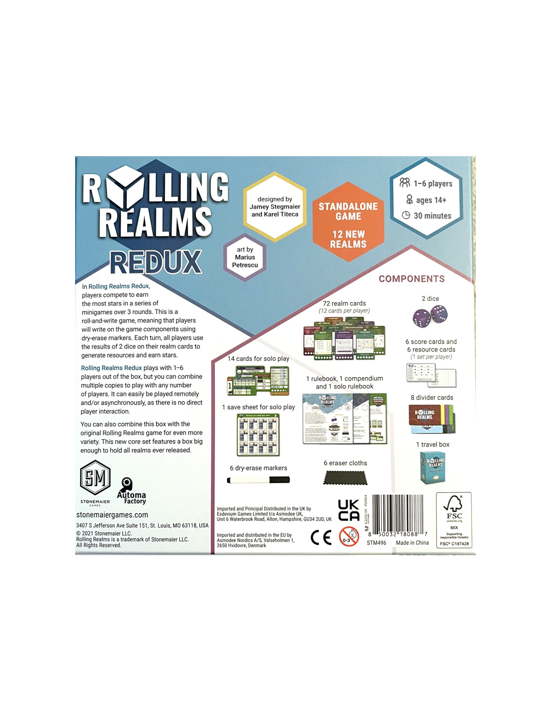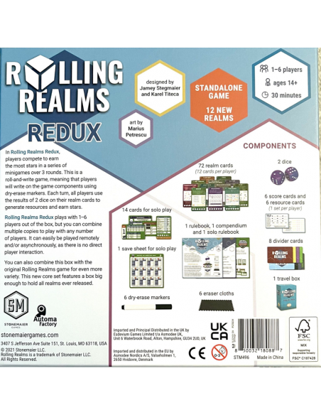 Rolling Realms Redux is a standalone game, and it includes everything you need to play up to 6 players. It features the same rules and full compatibility with its predecessor, Rolling Realms, but with 12 new realms inspired by popular games from other publishers, a printed version of the living rulebook that will include explanations for all realms (original, new, and promo), with everything in a box designed to fit all realms ever printed.