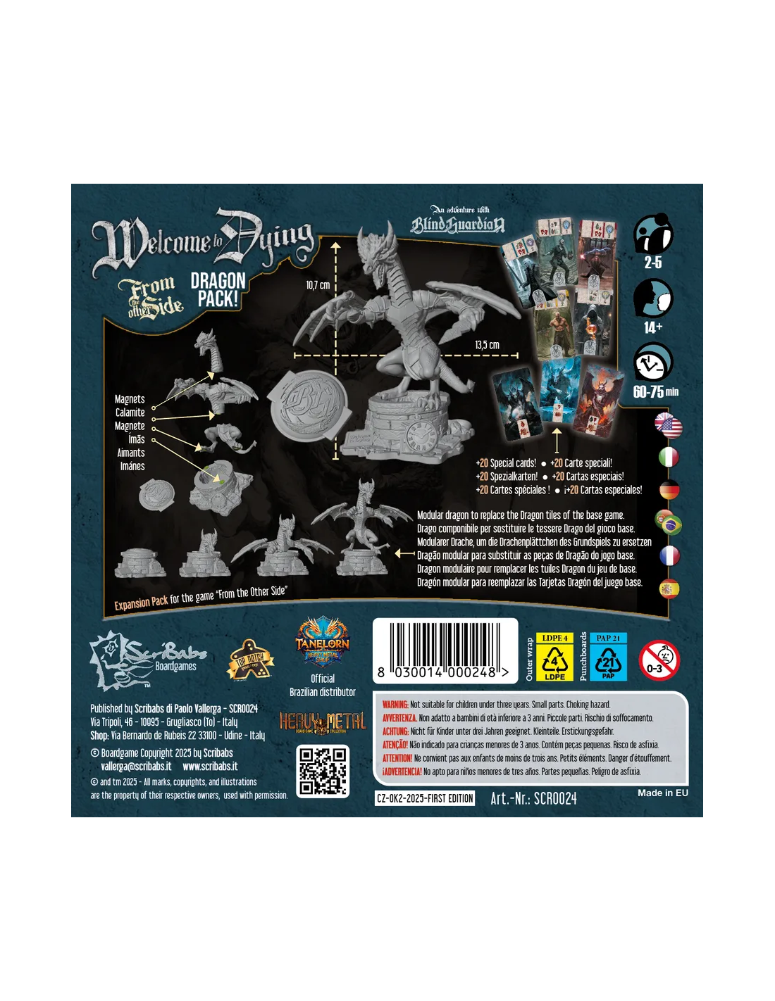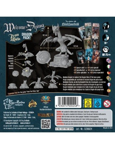 Welcome to Dying features a miniature dragon that can be assembled with magnets and replaces the Dragon board from the base game, but its operation remains the same: first the head comes out, then the torso with the head, and when the Dragon has completely emerged, the players lose the game.