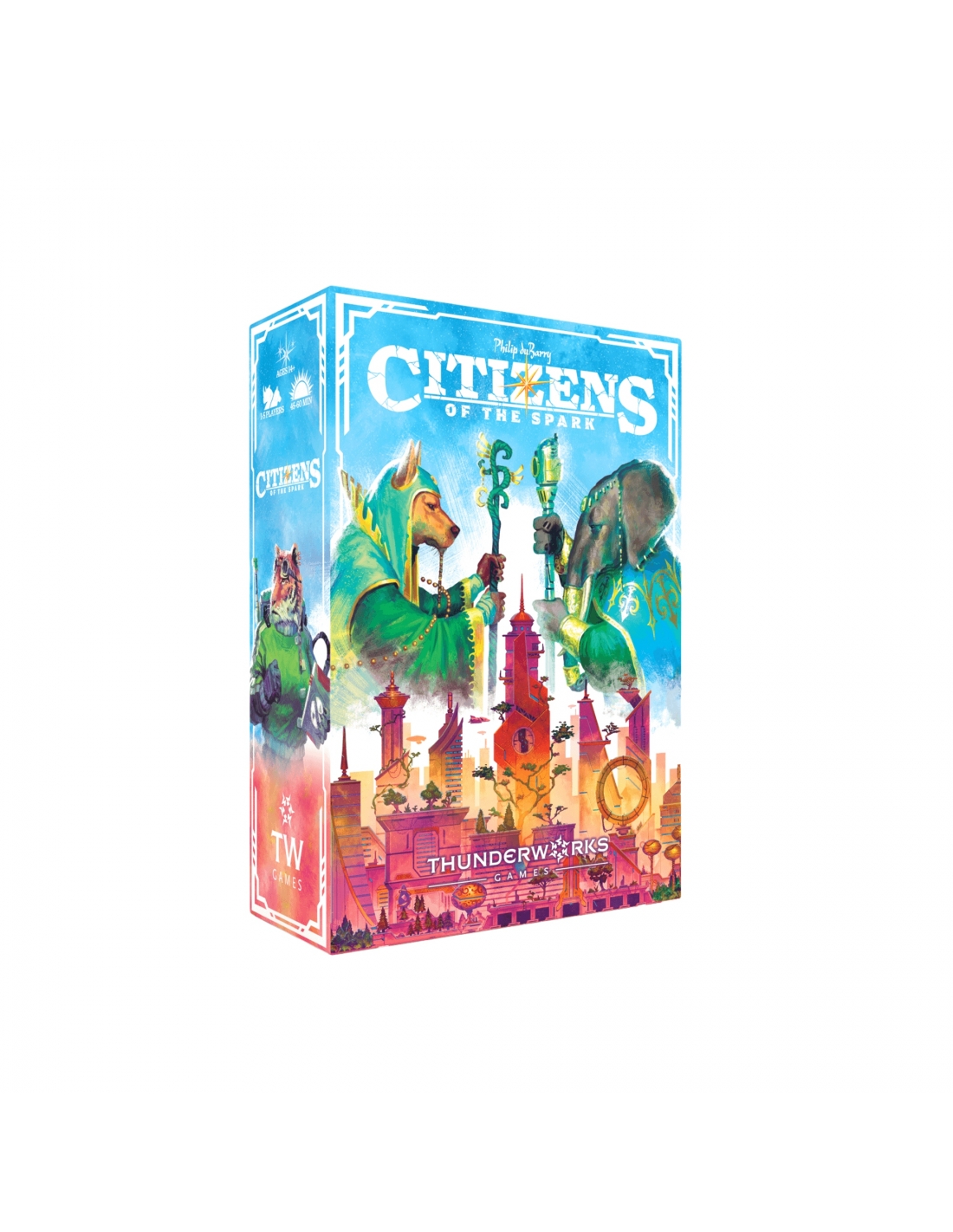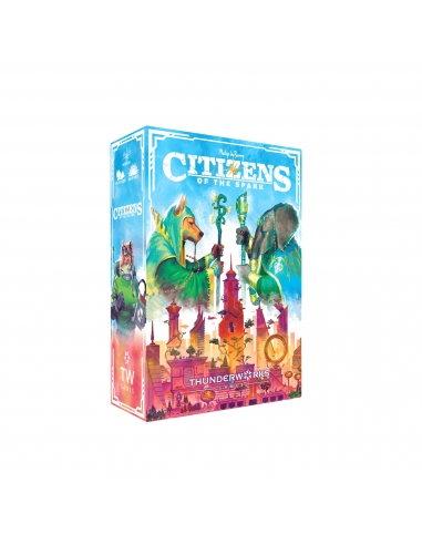 Citizens of the Spark is a variable set-up card game in which players take turns attracting citizens, taking actions, and claiming sparks. The more citizen cards a player has of a specific type, the more powerful that citizen's action becomes. The player with the most sparks in their city when the deck runs out wins!