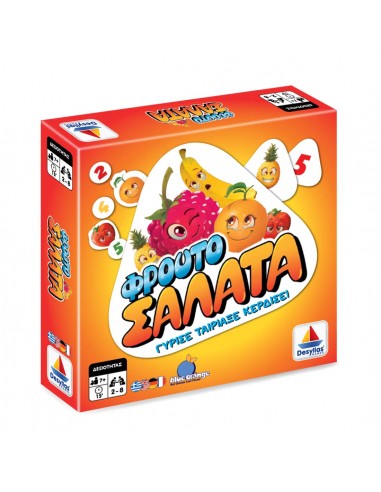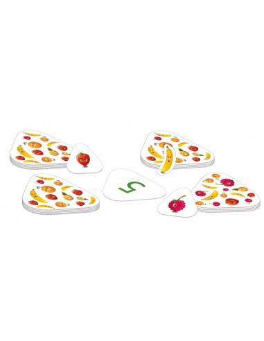 Players in Fast Flip need to react quickly to the fruit flying past them. To set up, players shuffle a deck of cards, with each card showing five types of fruit and with each type of fruit appearing 1-5 times on the card; the back of each card shows either a type of fruit or a number from 1-5. On a turn, someone flips over a card to reveal the fruit/number on the back of the top card as well as the front of a new card. If a fruit is revealed, whoever first yells out how many of that fruit are on the revealed card claims the flipped card; if a number, players compete to yell out whichever fruit appears that number of times. Once you flip through the entire deck, whoever has collected the most cards wins.