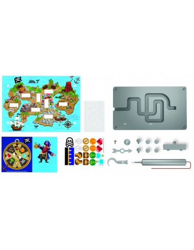 Build a unique board game, but first make sure you have a steady hand! Find the treasures and try to pick them up with the electric pirate hook. Be careful, it is buzzing!